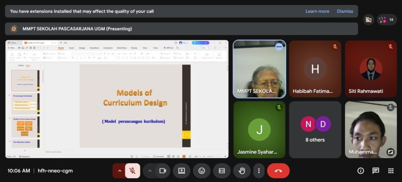 Yogyakarta, 9 Maret 2026 – Mahasiswa Program Studi Magister Manajemen Pendidikan Tinggi (MMPT) Sekolah Pascasarjana Universitas Gadjah Mada (UGM) mengikuti perkuliahan mata kuliah Pengembangan Kurikulum yang diampu oleh Dr. Wisjnu Martani, S.U. Perkuliahan dilaksanakan secara daring melalui platform Google Meet pada pukul 09.15–11.30 WIB sebagai bentuk penyesuaian kegiatan akademik menjelang meningkatnya mobilitas masyarakat dalam rangka persiapan arus mudik.